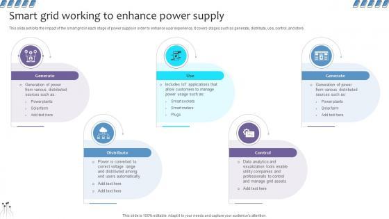 This slide exhibits the impact of the smart grid in each stage of power supply in order to enhance user experience. It covers stages such as generate, distribute, use, control, and store. This modern and well-arranged Empowering The Future Smart Grid Working To Enhance Power Supply IoT SS V provides lots of creative possibilities. It is very simple to customize and edit with the Powerpoint Software. Just drag and drop your pictures into the shapes. All facets of this template can be edited with Powerpoint, no extra software is necessary. Add your own material, put your images in the places assigned for them, adjust the colors, and then you can show your slides to the world, with an animated slide included. This slide exhibits the impact of the smart grid in each stage of power supply in order to enhance user experience. It covers stages such as generate, distribute, use, control, and store.