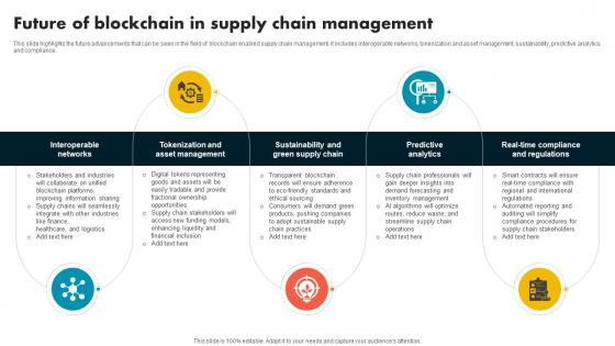 This slide highlights the future advancements that can be seen in the field of blockchain enabled supply chain management. It includes interoperable networks, tokenization and asset management, sustainability, predictive analytics and compliance. Here you can discover an assortment of the finest PowerPoint and Google Slides templates. With these templates, you can create presentations for a variety of purposes while simultaneously providing your audience with an eye-catching visual experience. Download Future Of Blockchain In Supply Chain Management Supply Chain Evolution Harnessing The Power BCT SS V to deliver an impeccable presentation. These templates will make your job of preparing presentations much quicker, yet still, maintain a high level of quality. Slidegeeks has experienced researchers who prepare these templates and write high-quality content for you. Later on, you can personalize the content by editing the Future Of Blockchain In Supply Chain Management Supply Chain Evolution Harnessing The Power BCT SS V. This slide highlights the future advancements that can be seen in the field of blockchain enabled supply chain management. It includes interoperable networks, tokenization and asset management, sustainability, predictive analytics and compliance.