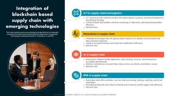 This slide mentions various upcoming technologies that can be integrated alongside blockchain for formulating efficient supply chain management. Technologies mentioned include IoT, Wearables, AI and RPA. Get a simple yet stunning designed Integration Of Blockchain Based Supply Chain Supply Chain Evolution Harnessing The Power BCT SS V. It is the best one to establish the tone in your meetings. It is an excellent way to make your presentations highly effective. So, download this PPT today from Slidegeeks and see the positive impacts. Our easy-to-edit Integration Of Blockchain Based Supply Chain Supply Chain Evolution Harnessing The Power BCT SS V can be your go-to option for all upcoming conferences and meetings. So, what are you waiting for Grab this template today. This slide mentions various upcoming technologies that can be integrated alongside blockchain for formulating efficient supply chain management. Technologies mentioned include IoT, Wearables, AI and RPA.