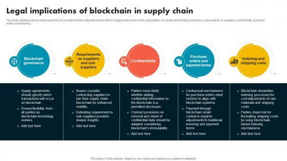 This slide mentions various legal aspects to be considered when integrating blockchain in supply chain system of an organization. It includes blockchain governance, requirements on suppliers, confidentiality, purchase orders and indexing.If you are looking for a format to display your unique thoughts, then the professionally designed Legal Implications Of Blockchain In Supply Chain Supply Chain Evolution Harnessing The Power BCT SS V is the one for you. You can use it as a Google Slides template or a PowerPoint template. Incorporate impressive visuals, symbols, images, and other charts. Modify or reorganize the text boxes as you desire. Experiment with shade schemes and font pairings. Alter, share or cooperate with other people on your work. Download Legal Implications Of Blockchain In Supply Chain Supply Chain Evolution Harnessing The Power BCT SS V and find out how to give a successful presentation. Present a perfect display to your team and make your presentation unforgettable. This slide mentions various legal aspects to be considered when integrating blockchain in supply chain system of an organization. It includes blockchain governance, requirements on suppliers, confidentiality, purchase orders and indexing.