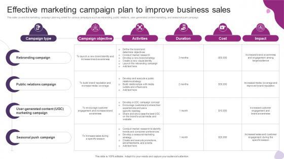 This slide covers the marketing campaign planning sheet for various campaigns such as rebranding, public relations, user-generated content marketing, and seasonal push campaign. Slidegeeks is here to make your presentations a breeze with Effective Marketing Campaign Plan To Improve Business Powerful Marketing Techniques Strategy SS V With our easy-to-use and customizable templates, you can focus on delivering your ideas rather than worrying about formatting. With a variety of designs to choose from, you are sure to find one that suits your needs. And with animations and unique photos, illustrations, and fonts, you can make your presentation pop. So whether you are giving a sales pitch or presenting to the board, make sure to check out Slidegeeks first This slide covers the marketing campaign planning sheet for various campaigns such as rebranding, public relations, user-generated content marketing, and seasonal push campaign.