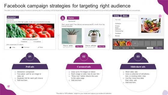 This slide covers various types of Facebook marketing ads for connecting with the target audience on the worlds largest social network. It includes different ad formats such as poll ads, slideshow ads, and carousel ads. Find highly impressive Facebook Campaign Strategies For Targeting Right Powerful Marketing Techniques Strategy SS V on Slidegeeks to deliver a meaningful presentation. You can save an ample amount of time using these presentation templates. No need to worry to prepare everything from scratch because Slidegeeks experts have already done a huge research and work for you. You need to download Facebook Campaign Strategies For Targeting Right Powerful Marketing Techniques Strategy SS V for your upcoming presentation. All the presentation templates are 100 percent editable and you can change the color and personalize the content accordingly. Download now This slide covers various types of Facebook marketing ads for connecting with the target audience on the worlds largest social network. It includes different ad formats such as poll ads, slideshow ads, and carousel ads.