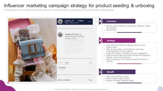 This slide illustrates the influencer campaign for product seeding and unboxing to increase brand awareness. It includes information such as campaign overview, strategy, and benefits. Coming up with a presentation necessitates that the majority of the effort goes into the content and the message you intend to convey. The visuals of a PowerPoint presentation can only be effective if it supplements and supports the story that is being told. Keeping this in mind our experts created Influencer Marketing Campaign Strategy For Product Powerful Marketing Techniques Strategy SS V to reduce the time that goes into designing the presentation. This way, you can concentrate on the message while our designers take care of providing you with the right template for the situation. This slide illustrates the influencer campaign for product seeding and unboxing to increase brand awareness. It includes information such as campaign overview, strategy, and benefits.