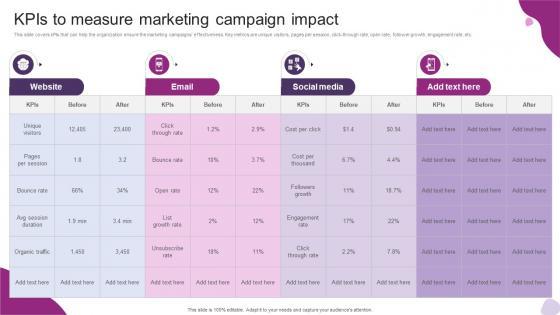 This slide covers kPIs that can help the organization ensure the marketing campaigns effectiveness. Key metrics are unique visitors, pages per session, click-through rate, open rate, follower growth, engagement rate, etc. Do you know about Slidesgeeks Kpis To Measure Marketing Campaign Impact Powerful Marketing Techniques Strategy SS V These are perfect for delivering any kind od presentation. Using it, create PowerPoint presentations that communicate your ideas and engage audiences. Save time and effort by using our pre-designed presentation templates that are perfect for a wide range of topic. Our vast selection of designs covers a range of styles, from creative to business, and are all highly customizable and easy to edit. Download as a PowerPoint template or use them as Google Slides themes. This slide covers kPIs that can help the organization ensure the marketing campaigns effectiveness. Key metrics are unique visitors, pages per session, click-through rate, open rate, follower growth, engagement rate, etc.