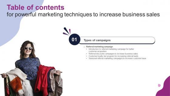 Are you searching for a Table Of Contents Powerful Marketing Techniques To Increase Business Sales Strategy SS V that is uncluttered, straightforward, and original Its easy to edit, and you can change the colors to suit your personal or business branding. For a presentation that expresses how much effort you have put in, this template is ideal With all of its features, including tables, diagrams, statistics, and lists, its perfect for a business plan presentation. Make your ideas more appealing with these professional slides. Download Table Of Contents Powerful Marketing Techniques To Increase Business Sales Strategy SS V from Slidegeeks today. Our Table Of Contents Powerful Marketing Techniques To Increase Business Sales Strategy SS V are topically designed to provide an attractive backdrop to any subject. Use them to look like a presentation pro.