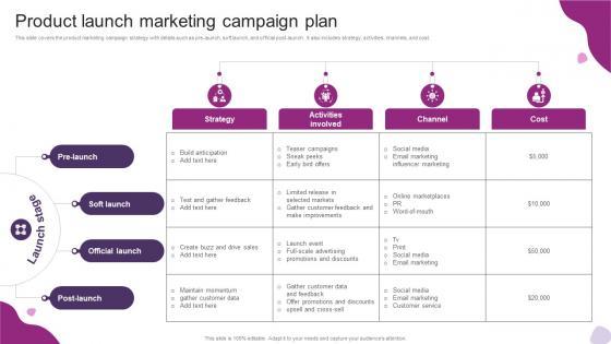 This slide covers the product marketing campaign strategy with details such as pre-launch, soft launch, and official post-launch. It also includes strategy, activities, channels, and cost. Do you have an important presentation coming up Are you looking for something that will make your presentation stand out from the rest Look no further than Product Launch Marketing Campaign Plan Powerful Marketing Techniques Strategy SS V. With our professional designs, you can trust that your presentation will pop and make delivering it a smooth process. And with Slidegeeks, you can trust that your presentation will be unique and memorable. So why wait Grab Product Launch Marketing Campaign Plan Powerful Marketing Techniques Strategy SS V today and make your presentation stand out from the rest This slide covers the product marketing campaign strategy with details such as pre-launch, soft launch, and official post-launch. It also includes strategy, activities, channels, and cost.