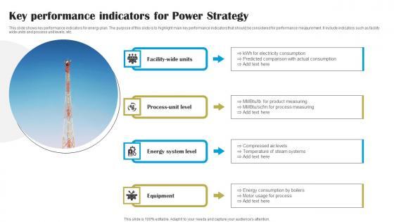 This slide shows key performance indicators for energy plan. The purpose of this slide is to highlight main key performance indicators that should be considered for performance measurement. It include indicators such as facility wide units and process unit levels, etc.Pitch your topic with ease and precision using this Key Performance Indicators For Power Strategy Template Pdf This layout presents information on Electricity Consumption, Process Measuring, Temperature Steam Systems It is also available for immediate download and adjustment. So, changes can be made in the color, design, graphics or any other component to create a unique layout. This slide shows key performance indicators for energy plan. The purpose of this slide is to highlight main key performance indicators that should be considered for performance measurement. It include indicators such as facility wide units and process unit levels, etc.