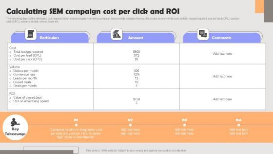 The following depicts the estimated cost required to run search engine marketing campaign and promote decision making. It includes key elements such as total budget required, cos per lead CPL, cost per click CPC, conversion rate, closed deals etc. There are so many reasons you need a Improving PPC Campaign Results Calculating Sem Campaign Cost Per Click And Roi Sample Pdf. The first reason is you can not spend time making everything from scratch, Thus, Slidegeeks has made presentation templates for you too. You can easily download these templates from our website easily. The following depicts the estimated cost required to run search engine marketing campaign and promote decision making. It includes key elements such as total budget required, cos per lead CPL, cost per click CPC, conversion rate, closed deals etc.