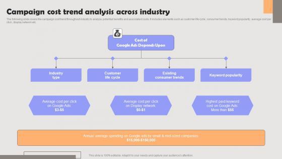 The following slide covers the campaign cost trend throughout industry to analyze potential benefits and associated costs. It includes elements such as customer life cycle, consumer trends, keyword popularity, average cost per click, display network etc. Do you have to make sure that everyone on your team knows about any specific topic I yes, then you should give Improving PPC Campaign Results Campaign Cost Trend Analysis Across Industry Professional Pdf a try. Our experts have put a lot of knowledge and effort into creating this impeccable Improving PPC Campaign Results Campaign Cost Trend Analysis Across Industry Professional Pdf. You can use this template for your upcoming presentations, as the slides are perfect to represent even the tiniest detail. You can download these templates from the Slidegeeks website and these are easy to edit. So grab these today. The following slide covers the campaign cost trend throughout industry to analyze potential benefits and associated costs. It includes elements such as customer life cycle, consumer trends, keyword popularity, average cost per click, display network etc.