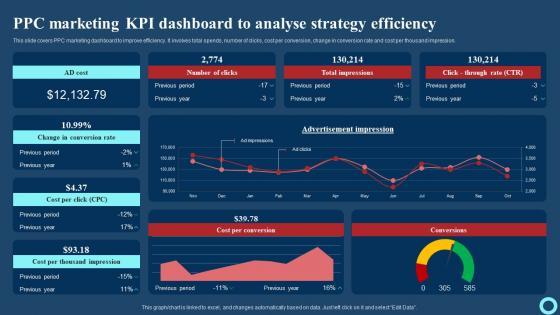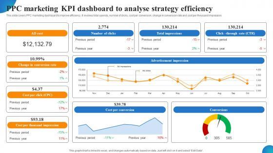 This slide covers PPC marketing dashboard to improve efficiency. It involves total spends, number of clicks, cost per conversion, change in conversion rate and cost per thousand impression. Welcome to our selection of the PPC Marketing KPI Dashboard To Analyse Strategy Efficiency Effective Strategies To Enhance Mockup Pdf These are designed to help you showcase your creativity and bring your sphere to life. Planning and Innovation are essential for any business that is just starting out. This collection contains the designs that you need for your everyday presentations. All of our PowerPoints are 100 percent editable, so you can customize them to suit your needs. This multi-purpose template can be used in various situations. Grab these presentation templates today. This slide covers PPC marketing dashboard to improve efficiency. It involves total spends, number of clicks, cost per conversion, change in conversion rate and cost per thousand impression.