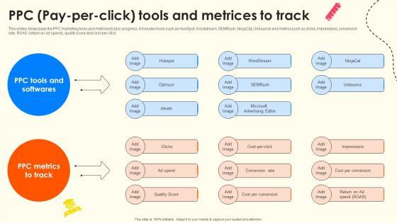 This slides showcases the PPC marketing tools and metrices to tack progress. It includes tools such as HubSpot, Wordstream, SEMRush, NinjaCat, Unbounce and metrics such as clicks, impressions, conversion rate, ROAS return on ad spend , quality score and cost-per-click. Want to ace your presentation in front of a live audience Our PPC Pay Per Click Tools And Metrices To Track School Enrollment Enhancement Strategy SS V can help you do that by engaging all the users towards you. Slidegeeks experts have put their efforts and expertise into creating these impeccable powerpoint presentations so that you can communicate your ideas clearly. Moreover, all the templates are customizable, and easy-to-edit and downloadable. Use these for both personal and commercial use. This slides showcases the PPC marketing tools and metrices to tack progress. It includes tools such as HubSpot, Wordstream, SEMRush, NinjaCat, Unbounce and metrics such as clicks, impressions, conversion rate, ROAS return on ad spend , quality score and cost-per-click.
