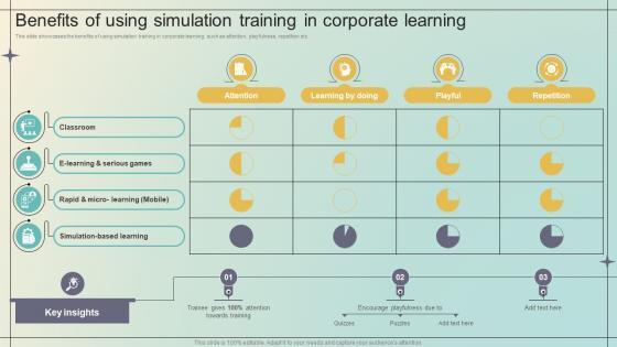 This slide showcases the benefits of using simulation training in corporate learning, such as attention, playfulness, repetition etc. Want to ace your presentation in front of a live audience Our Immersive Training For Practical Benefits Of Using Simulation Training In Corporate Learning DTE SS V can help you do that by engaging all the users towards you. Slidegeeks experts have put their efforts and expertise into creating these impeccable powerpoint presentations so that you can communicate your ideas clearly. Moreover, all the templates are customizable, and easy-to-edit and downloadable. Use these for both personal and commercial use. This slide showcases the benefits of using simulation training in corporate learning, such as attention, playfulness, repetition etc.