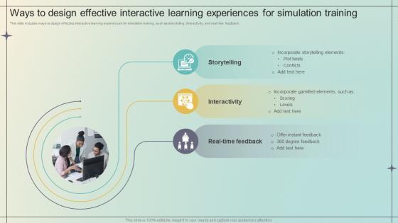 This slide includes ways to design effective interactive learning experiences for simulation training, such as storytelling, interactivity, and real time feedback. Take your projects to the next level with our ultimate collection of Immersive Training For Practical Ways To Design Effective Interactive Learning DTE SS V. Slidegeeks has designed a range of layouts that are perfect for representing task or activity duration, keeping track of all your deadlines at a glance. Tailor these designs to your exact needs and give them a truly corporate look with your own brand colors they will make your projects stand out from the rest This slide includes ways to design effective interactive learning experiences for simulation training, such as storytelling, interactivity, and real time feedback.