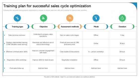 Following slide represents training program implemented by company to enhance sales team skills and knowledge for improved sales operations. Present like a pro with Training Plan For Successful Sales Cycle Optimization Best Practices Ppt Powerpoint SA SS V Create beautiful presentations together with your team, using our easy-to-use presentation slides. Share your ideas in real-time and make changes on the fly by downloading our templates. So whether you are in the office, on the go, or in a remote location, you can stay in sync with your team and present your ideas with confidence. With Slidegeeks presentation got a whole lot easier. Grab these presentations today. Following slide represents training program implemented by company to enhance sales team skills and knowledge for improved sales operations.