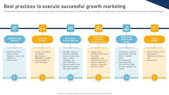 This slide showcases the best practices for marketer to execute effective growth marketing strategy. It incorporates audience segmentation, competitor analysis, multichannel approach, cross functional team, constant updates etc. Boost your pitch with our creative A Comprehensive Approach To Best Practices To Execute Successful Growth Marketing MKT SS V. Deliver an awe-inspiring pitch that will mesmerize everyone. Using these presentation templates you will surely catch everyones attention. You can browse the ppts collection on our website. We have researchers who are experts at creating the right content for the templates. So you do not have to invest time in any additional work. Just grab the template now and use them. This slide showcases the best practices for marketer to execute effective growth marketing strategy. It incorporates audience segmentation, competitor analysis, multichannel approach, cross functional team, constant updates etc.