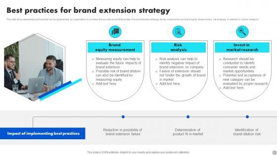 This slide showcases best practices that can be implemented by organization to increase the success and effectiveness of brand extension strategy. Its key components are brand equity measurement, risk analysis, investment in market research. Create an editable Best Practices For Brand Extension Strategy Brand Diversification Approach Guidelines Pdf that communicates your idea and engages your audience. Whether you are presenting a business or an educational presentation, pre-designed presentation templates help save time. Best Practices For Brand Extension Strategy Brand Diversification Approach Guidelines Pdf is highly customizable and very easy to edit, covering many different styles from creative to business presentations. Slidegeeks has creative team members who have crafted amazing templates. So, go and get them without any delay. This slide showcases best practices that can be implemented by organization to increase the success and effectiveness of brand extension strategy. Its key components are brand equity measurement, risk analysis, investment in market research.