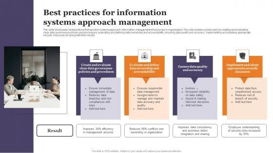 The slide showcases best practices that assist in systems approach information management of resources in organization. The side contains points such as creating and evaluating clear data governance policies and procedures, evaluating and defining data ownership and accountability, ensuring data quality and accuracy, implementing and adopting appropriate security measures etc along with their results. Showcasing this set of slides titled Best Practices For Information Systems Approach Management Professional Pdf The topics addressed in these templates are Policies And Procedures, Ownership And Accountability, Security Measures All the content presented in this PPT design is completely editable. Download it and make adjustments in color, background, font etc. as per your unique business setting. The slide showcases best practices that assist in systems approach information management of resources in organization. The side contains points such as creating and evaluating clear data governance policies and procedures, evaluating and defining data ownership and accountability, ensuring data quality and accuracy, implementing and adopting appropriate security measures etc along with their results.
