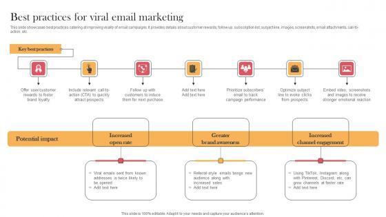 This slide showcases best practices catering at improving virality of email campaigns. It provides details about customer rewards, follow up, subscription list, subject line, images, screenshots, email attachments, call-to- action, etc. Do you have to make sure that everyone on your team knows about any specific topic I yes, then you should give Best Practices For Viral Email Marketing Designing Approaches Summary Pdf a try. Our experts have put a lot of knowledge and effort into creating this impeccable Best Practices For Viral Email Marketing Designing Approaches Summary Pdf. You can use this template for your upcoming presentations, as the slides are perfect to represent even the tiniest detail. You can download these templates from the Slidegeeks website and these are easy to edit. So grab these today This slide showcases best practices catering at improving virality of email campaigns. It provides details about customer rewards, follow up, subscription list, subject line, images, screenshots, email attachments, call-to- action, etc.