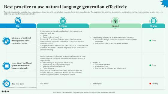 This slide describes the essential steps organizations should take while using Natural Language Generation more efficiently. The purpose of this slide is to showcase the best practices that can help businesses to serve clients in a better way and transform business internally. There are so many reasons you need a Best Practice To Use Natural Language Generation Effectively Natural Language Automation. The first reason is you can not spend time making everything from scratch, Thus, Slidegeeks has made presentation templates for you too. You can easily download these templates from our website easily. This slide describes the essential steps organizations should take while using Natural Language Generation more efficiently. The purpose of this slide is to showcase the best practices that can help businesses to serve clients in a better way and transform business internally.
