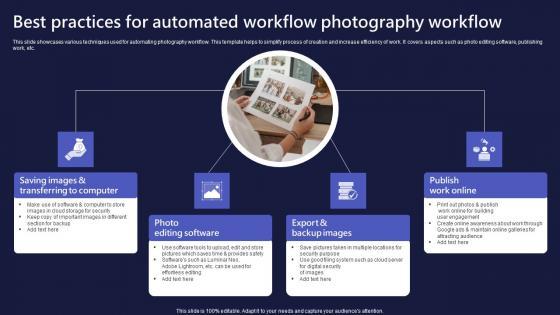 This slide showcases various techniques used for automating photography workflow. This template helps to simplify process of creation and increase efficiency of work. It covers aspects such as photo editing software, publishing work, etc.Pitch your topic with ease and precision using this Best Practices For Automated Workflow Photography Workflow Pictures Pdf This layout presents information on Transferring Computer, Editing Software, Create Online Awareness It is also available for immediate download and adjustment. So, changes can be made in the color, design, graphics or any other component to create a unique layout. This slide showcases various techniques used for automating photography workflow. This template helps to simplify process of creation and increase efficiency of work. It covers aspects such as photo editing software, publishing work, etc.