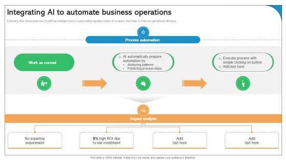 Following slide showcases role of artificial intelligenceAI in automating repetitive tasks of company that helps to improve operational efficiency Slidegeeks has constructed Integrating Ai To Automate Business Operations Best Practices Ppt Slide SA SS V after conducting extensive research and examination. These presentation templates are constantly being generated and modified based on user preferences and critiques from editors. Here, you will find the most attractive templates for a range of purposes while taking into account ratings and remarks from users regarding the content. This is an excellent jumping-off point to explore our content and will give new users an insight into our top-notch PowerPoint Templates. Following slide showcases role of artificial intelligenceAI in automating repetitive tasks of company that helps to improve operational efficiency