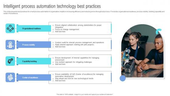 This slide presents best practices for smart process automation in organisation, helpful in increasing efficiency and reducing errors throughout process. IT includes organizational readiness, process viability, building capability and center of excellence. Pitch your topic with ease and precision using this Intelligent Process Automation Technology Best Practices Demonstration Pdf. This layout presents information on Organizational Readiness, Process Viability, Capability Building, Center Of Excellence. It is also available for immediate download and adjustment. So, changes can be made in the color, design, graphics or any other component to create a unique layout. This slide presents best practices for smart process automation in organisation, helpful in increasing efficiency and reducing errors throughout process. IT includes organizational readiness, process viability, building capability and center of excellence.