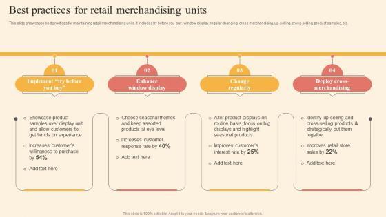 This slide showcases best practices for maintaining retail merchandising units. It includes try before you buy, window display, regular changing, cross merchandising, up selling, cross selling, product samples, etc. Slidegeeks is one of the best resources for PowerPoint templates. You can download easily and regulate Best Practices Retail Driving Business Success By Hosting Experiential Mockup Pdf for your personal presentations from our wonderful collection. A few clicks is all it takes to discover and get the most relevant and appropriate templates. Use our Templates to add a unique zing and appeal to your presentation and meetings. All the slides are easy to edit and you can use them even for advertisement purposes. This slide showcases best practices for maintaining retail merchandising units. It includes try before you buy, window display, regular changing, cross merchandising, up selling, cross selling, product samples, etc.