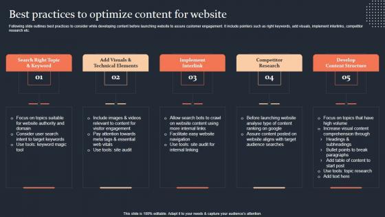 Following slide outlines best practices to consider while developing content before launching website to assure customer engagement. It include pointers such as right keywords, add visuals, implement interlinks, competitor research etc. Want to ace your presentation in front of a live audience Our Best Practices To Optimize Content For Website Step By Step Guide Information PDF can help you do that by engaging all the users towards you. Slidegeeks experts have put their efforts and expertise into creating these impeccable powerpoint presentations so that you can communicate your ideas clearly. Moreover, all the templates are customizable, and easy-to-edit and downloadable. Use these for both personal and commercial use. Following slide outlines best practices to consider while developing content before launching website to assure customer engagement. It include pointers such as right keywords, add visuals, implement interlinks, competitor research etc.
