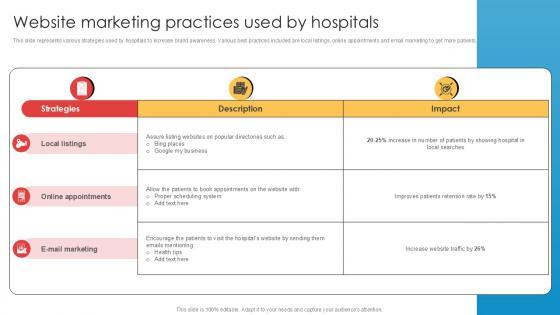 This slide represents various strategies used by hospitals to increase brand awareness. Various best practices included are local listings, online appointments and email marketing to get more patients. Presenting this PowerPoint presentation, titled Website Marketing Practices Used By Hospitals Implementation Of Online Ppt Slides, with topics curated by our researchers after extensive research. This editable presentation is available for immediate download and provides attractive features when used. Download now and captivate your audience. Presenting this Website Marketing Practices Used By Hospitals Implementation Of Online Ppt Slides. Our researchers have carefully researched and created these slides with all aspects taken into consideration. This is a completely customizable Website Marketing Practices Used By Hospitals Implementation Of Online Ppt Slides that is available for immediate downloading. Download now and make an impact on your audience. Highlight the attractive features available with our PPTs. This slide represents various strategies used by hospitals to increase brand awareness. Various best practices included are local listings, online appointments and email marketing to get more patients.