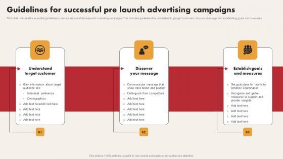 This slide includes the essential guidelines to make a successful pre launch marketing campaigns. This includes guidelines like understanding target customers, discover message and establishing goals and measures. Showcasing this set of slides titled Guidelines For Successful Pre Launch Advertising Campaigns Graphics Pdf. The topics addressed in these templates are Establish Goals And Measures, Understand Target Customer, Demographics. All the content presented in this PPT design is completely editable. Download it and make adjustments in color, background, font etc. as per your unique business setting. This slide includes the essential guidelines to make a successful pre launch marketing campaigns. This includes guidelines like understanding target customers, discover message and establishing goals and measures.