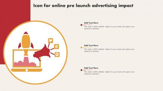 Pitch your topic with ease and precision using this Icon For Online Pre Launch Advertising Impact Rules Pdf. This layout presents information on Icon Online Pre Launch, Advertising Impact. It is also available for immediate download and adjustment. So, changes can be made in the color, design, graphics or any other component to create a unique layout. Our Icon For Online Pre Launch Advertising Impact Rules Pdf are topically designed to provide an attractive backdrop to any subject. Use them to look like a presentation pro.