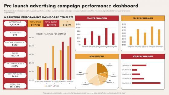 This slide includes the dashboard for evaluating performance of pre launch marketing campaigns conducted by businesses. This includes budget allocated by company, impression, acquisitions etc Pitch your topic with ease and precision using this Pre Launch Advertising Campaign Performance Dashboard Graphics Pdf. This layout presents information on Pre Launch Advertising Campaign, Performance Dashboard. It is also available for immediate download and adjustment. So, changes can be made in the color, design, graphics or any other component to create a unique layout. This slide includes the dashboard for evaluating performance of pre launch marketing campaigns conducted by businesses. This includes budget allocated by company, impression, acquisitions etc