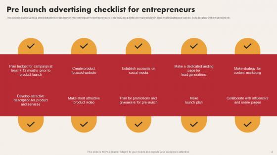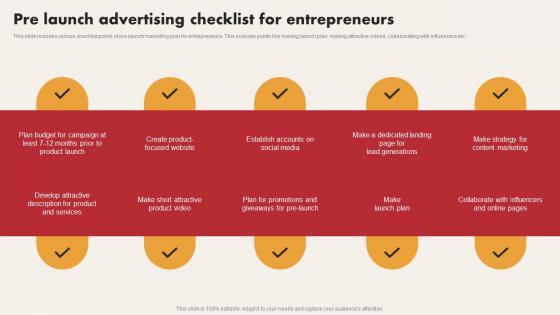 This slide includes various checklist points of pre launch marketing plan for entrepreneurs. This includes points like making launch plan, making attractive videos, collaborating with influencers etc. Pitch your topic with ease and precision using this Pre Launch Advertising Checklist For Entrepreneurs Rules Pdf. This layout presents information on Product Launch, Product And Services, Social Media. It is also available for immediate download and adjustment. So, changes can be made in the color, design, graphics or any other component to create a unique layout. This slide includes various checklist points of pre launch marketing plan for entrepreneurs. This includes points like making launch plan, making attractive videos, collaborating with influencers etc.