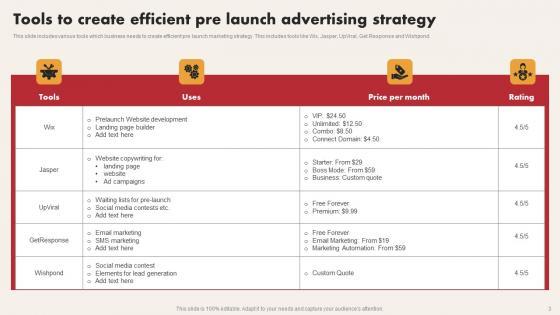 This slide includes various tools which business needs to create efficient pre launch marketing strategy. This includes tools like Wix, Jasper, UpViral, Get Response and Wishpond. Showcasing this set of slides titled Tools To Create Efficient Pre Launch Advertising Strategy Structure Pdf. The topics addressed in these templates are Social Media, Email Marketing, Premium. All the content presented in this PPT design is completely editable. Download it and make adjustments in color, background, font etc. as per your unique business setting. This slide includes various tools which business needs to create efficient pre launch marketing strategy. This includes tools like Wix, Jasper, UpViral, Get Response and Wishpond.