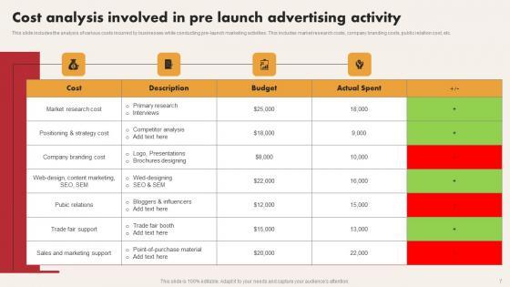 This slide includes the analysis of various costs incurred by businesses while conducting pre launch marketing activities. This includes market research costs, company branding costs, public relation cost, etc. Pitch your topic with ease and precision using this Cost Analysis Involved In Pre Launch Advertising Activity Designs Pdf. This layout presents information on Sales And Marketing Support, Company Branding Cost, Market Research Cost. It is also available for immediate download and adjustment. So, changes can be made in the color, design, graphics or any other component to create a unique layout. This slide includes the analysis of various costs incurred by businesses while conducting pre launch marketing activities. This includes market research costs, company branding costs, public relation cost, etc.