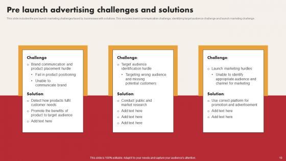 This slide includes the pre launch marketing challenges faced by businesses with solutions. This includes brand communication challenge, identifying target audience challenge and launch marketing challenge. Showcasing this set of slides titled Pre Launch Advertising Challenges And Solutions Background Pdf. The topics addressed in these templates are Product Placement Hurdle, Product Positioning, Communicate Brand. All the content presented in this PPT design is completely editable. Download it and make adjustments in color, background, font etc. as per your unique business setting. This slide includes the pre launch marketing challenges faced by businesses with solutions. This includes brand communication challenge, identifying target audience challenge and launch marketing challenge.