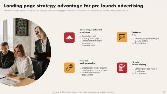 This slide includes the advantages of landing page strategy for pre launch marketing plan. This includes an increase in SEO, enhanced lead generation, creating brand identity, etc. Pitch your topic with ease and precision using this Landing Page Strategy Advantage For Pre Launch Advertising Information Pdf. This layout presents information on Increase Lead Generation, Create Brand Identity, Increase SEO. It is also available for immediate download and adjustment. So, changes can be made in the color, design, graphics or any other component to create a unique layout. This slide includes the advantages of landing page strategy for pre launch marketing plan. This includes an increase in SEO, enhanced lead generation, creating brand identity, etc.