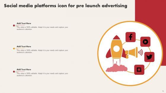 Showcasing this set of slides titled Social Media Platforms Icon For Pre Launch Advertising Mockup Pdf. The topics addressed in these templates are Social Media Platforms Icon, Pre Launch Advertising. All the content presented in this PPT design is completely editable. Download it and make adjustments in color, background, font etc. as per your unique business setting. Our Social Media Platforms Icon For Pre Launch Advertising Mockup Pdf are topically designed to provide an attractive backdrop to any subject. Use them to look like a presentation pro.