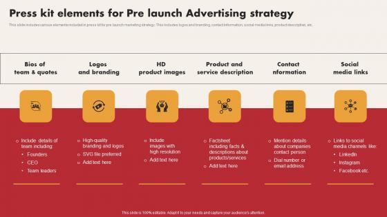 This slide includes various elements included in press kit for pre launch marketing strategy. This includes logos and branding, contact information, social media links, product description, etc. Showcasing this set of slides titled Press Kit Elements For Pre Launch Advertising Strategy Introduction Pdf. The topics addressed in these templates are Logos And Branding, Product And Service Description, Social Media Links. All the content presented in this PPT design is completely editable. Download it and make adjustments in color, background, font etc. as per your unique business setting. This slide includes various elements included in press kit for pre launch marketing strategy. This includes logos and branding, contact information, social media links, product description, etc.