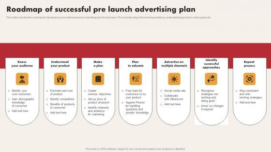 This slide includes the roadmap for developing successful pre launch marketing plan for business. This includes steps like knowing audience, understanding product, making plan etc. Pitch your topic with ease and precision using this Roadmap Of Successful Pre Launch Advertising Plan Structure Pdf. This layout presents information on Make A Plan, Plan To Educate, Advertise On Multiple Channels. It is also available for immediate download and adjustment. So, changes can be made in the color, design, graphics or any other component to create a unique layout. This slide includes the roadmap for developing successful pre launch marketing plan for business. This includes steps like knowing audience, understanding product, making plan etc.