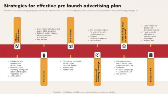 This slide includes various strategies to develop an effective pre launch marketing plan. This includes hosting events and webinars, building press kit, launching email marketing campaigns, etc. Pitch your topic with ease and precision using this Strategies For Effective Pre Launch Advertising Plan Inspiration Pdf. This layout presents information on Customer Engagement, Marketing Strategy, Consumer Insights. It is also available for immediate download and adjustment. So, changes can be made in the color, design, graphics or any other component to create a unique layout. This slide includes various strategies to develop an effective pre launch marketing plan. This includes hosting events and webinars, building press kit, launching email marketing campaigns, etc.