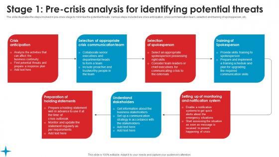 The slide illustrates the steps involved in pre crisis stage to minimize the potential threats. Various steps included are crisis anticipation, crisis communication team, selection and training of spokesperson, etc. This Stage 1 Pre Crisis Analysis Identifying Strategic Guide Crisis Communication Planning Elements Pdf is perfect for any presentation, be it in front of clients or colleagues. It is a versatile and stylish solution for organizing your meetings. The Stage 1 Pre Crisis Analysis Identifying Strategic Guide Crisis Communication Planning Elements Pdf features a modern design for your presentation meetings. The adjustable and customizable slides provide unlimited possibilities for acing up your presentation. Slidegeeks has done all the homework before launching the product for you. So, do not wait, grab the presentation templates today The slide illustrates the steps involved in pre crisis stage to minimize the potential threats. Various steps included are crisis anticipation, crisis communication team, selection and training of spokesperson, etc.