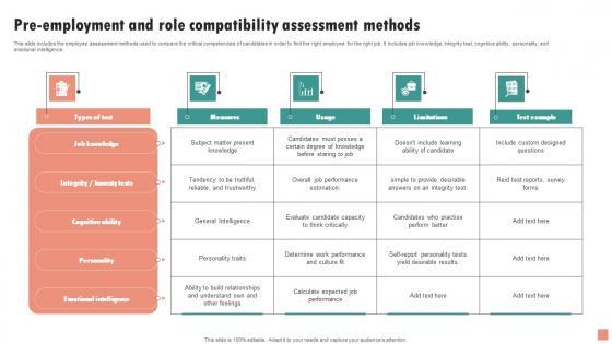 This slide includes the employee assessment methods used to compare the critical competencies of candidates in order to find the right employee for the right job. It includes job knowledge, integrity test, cognitive ability, personality, and emotional intelligence. Showcasing this set of slides titled Pre Employment And Role Compatibility Assessment Methods Elements Pdf. The topics addressed in these templates are Job Knowledge, Integrity Test, Cognitive Ability. All the content presented in this PPT design is completely editable. Download it and make adjustments in color, background, font etc. as per your unique business setting. This slide includes the employee assessment methods used to compare the critical competencies of candidates in order to find the right employee for the right job. It includes job knowledge, integrity test, cognitive ability, personality, and emotional intelligence.