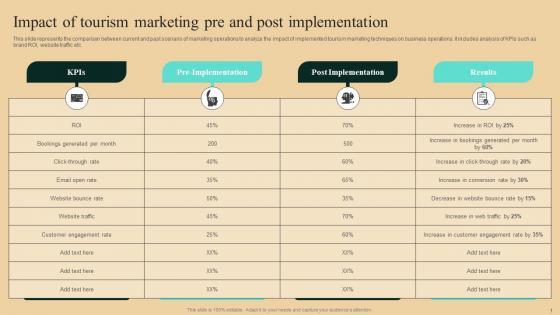 This slide represents the comparison between current and past scenario of marketing operations to analyze the impact of implemented tourism marketing techniques on business operations. It includes analysis of KPIs such as brand ROI, website traffic etc. The best PPT templates are a great way to save time, energy, and resources. Slidegeeks have 100 percent editable powerpoint slides making them incredibly versatile. With these quality presentation templates, you can create a captivating and memorable presentation by combining visually appealing slides and effectively communicating your message. Download Guide To Winning Tourism Impact Of Tourism Marketing Pre And Post Implementation Designs Pdf from Slidegeeks and deliver a wonderful presentation. This slide represents the comparison between current and past scenario of marketing operations to analyze the impact of implemented tourism marketing techniques on business operations. It includes analysis of KPIs such as brand ROI, website traffic etc.