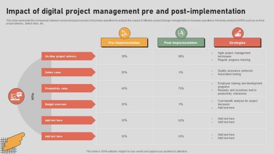 This slide represents the comparison between current and past scenario of business operations to analyze the impact of effective project change management on business operations. It includes analysis of KPIs such as on-time project delivery, defect rates, etc. Crafting an eye-catching presentation has never been more straightforward. Let your presentation shine with this tasteful yet straightforward Impact Of Digital Project Management Pre And Post Implementation Strategies For Success In Digital template. It offers a minimalistic and classy look that is great for making a statement. The colors have been employed intelligently to add a bit of playfulness while still remaining professional. Construct the ideal Impact Of Digital Project Management Pre And Post Implementation Strategies For Success In Digital that effortlessly grabs the attention of your audience Begin now and be certain to wow your customers This slide represents the comparison between current and past scenario of business operations to analyze the impact of effective project change management on business operations. It includes analysis of KPIs such as on-time project delivery, defect rates, etc.
