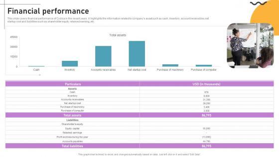This slide covers financial performance of Cyclica in the recent years. It highlights the information related to companys asset such as cash, inventory, account receivables,net startup cost and liabilities such as shareholder equity, retained earning, etc. From laying roadmaps to briefing everything in detail, our templates are perfect for you. You can set the stage with your presentation slides. All you have to do is download these easy-to-edit and customizable templates. Financial Performance Cloud Based Predictive Analytics Software Pitch Deck will help you deliver an outstanding performance that everyone would remember and praise you for. Do download this presentation today. This slide covers financial performance of Cyclica in the recent years. It highlights the information related to companys asset such as cash, inventory, account receivables,net startup cost and liabilities such as shareholder equity, retained earning, etc.