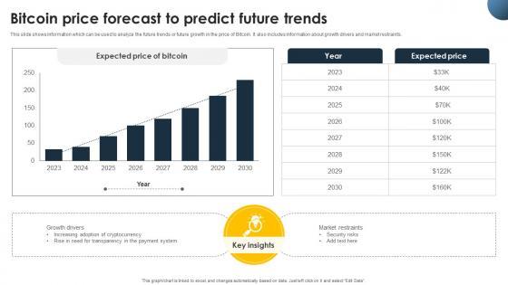 This slide shows information which can be used to analyze the future trends or future growth in the price of Bitcoin. It also includes information about growth drivers and market restraints. Do you have to make sure that everyone on your team knows about any specific topic I yes, then you should give Complete Beginners Guide Bitcoin Price Forecast To Predict Future Trends Fin SS V a try. Our experts have put a lot of knowledge and effort into creating this impeccable Complete Beginners Guide Bitcoin Price Forecast To Predict Future Trends Fin SS V. You can use this template for your upcoming presentations, as the slides are perfect to represent even the tiniest detail. You can download these templates from the Slidegeeks website and these are easy to edit. So grab these today This slide shows information which can be used to analyze the future trends or future growth in the price of Bitcoin. It also includes information about growth drivers and market restraints.