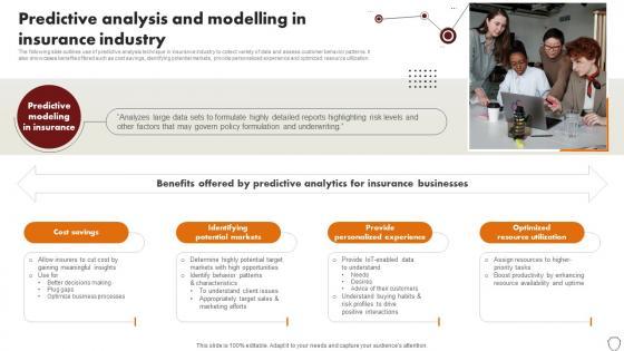 The following slide outlines use of predictive analysis technique in insurance industry to collect variety of data and assess customer behavior patterns. It also showcases benefits offered such as cost savings, identifying potential markets, provide personalized experience and optimized resource utilization. Find highly impressive Technology Trends In Online Insurance Predictive Analysis And Modelling In Insurance Industry on Slidegeeks to deliver a meaningful presentation. You can save an ample amount of time using these presentation templates. No need to worry to prepare everything from scratch because Slidegeeks experts have already done a huge research and work for you. You need to download Technology Trends In Online Insurance Predictive Analysis And Modelling In Insurance Industry for your upcoming presentation. All the presentation templates are 100 percent editable and you can change the color and personalize the content accordingly. Download now The following slide outlines use of predictive analysis technique in insurance industry to collect variety of data and assess customer behavior patterns. It also showcases benefits offered such as cost savings, identifying potential markets, provide personalized experience and optimized resource utilization.