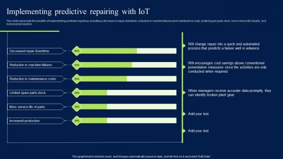 This slide represents the benefits of implementing predictive repairing, including a decrease in repair downtime, reduction in machine failures and maintenance costs, limited spare parts stock, more service life of parts, and increased production. Retrieve professionally designed Intelligent Manufacturing Implementing Predictive Repairing With Iot Portrait PDF to effectively convey your message and captivate your listeners. Save time by selecting pre made slideshows that are appropriate for various topics, from business to educational purposes. These themes come in many different styles, from creative to corporate, and all of them are easily adjustable and can be edited quickly. Access them as PowerPoint templates or as Google Slides themes. You do not have to go on a hunt for the perfect presentation because Slidegeeks got you covered from everywhere.