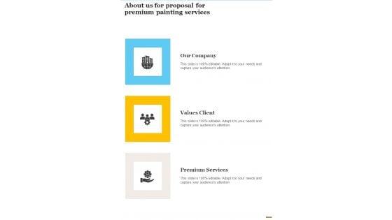 Presenting you an exemplary About Us For Proposal For Premium Painting Services One Pager Sample Example Document. Our one-pager comprises all the must-have essentials of an inclusive document. You can edit it with ease, as its layout is completely editable. With such freedom, you can tweak its design and other elements to your requirements. Download this About Us For Proposal For Premium Painting Services One Pager Sample Example Document brilliant piece now. Our About Us For Proposal For Premium Painting Services One Pager Sample Example Document are topically designed to provide an attractive backdrop to any subject. Use them to look like a presentation pro.